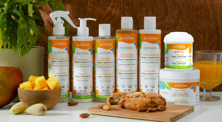 Les actifs choisis pour la gamme Actikids sont la Mangue, qui va nourrir et réparer les cheveux, et l’Amande Douce, qui va adoucir et hydrater.