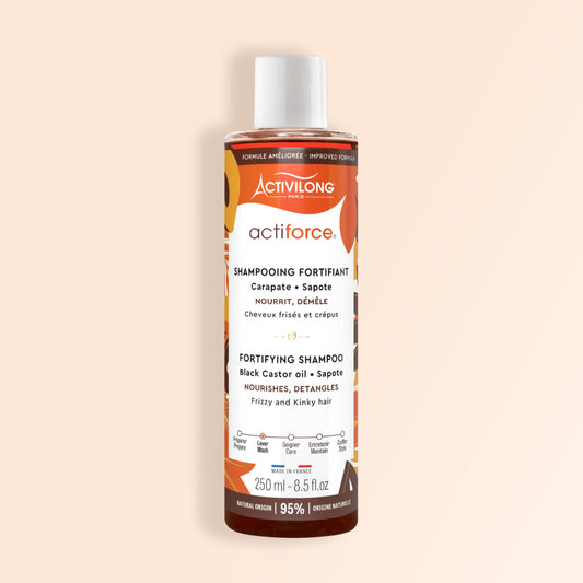Curly or frizzy textured hair is often more fragile and prone to breakage. To strengthen it, it's essential to use suitable products rich in protein (keratin) and nourishing active ingredients such as castor oil, shea butter, or Carapate. A targeted routine helps strengthen the hair fiber, improve hair elasticity, and prevent breakage. By combining protein treatments with deep hydration, you promote stronger, shinier, and more vibrant hair. Give your hair the strength and vitality it needs with our Actiforce products!