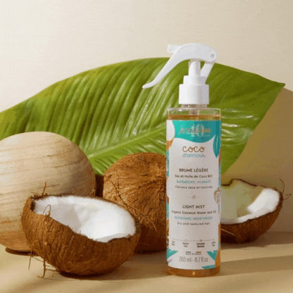 Is your hair thirsty for love? Refresh it with the Coco d'Amour Light Mist! Its fluid, non-greasy texture, enriched with Organic Coconut Oil and Organic Coconut Water, is very similar to natural coconut water. With one spray, it's done! Your hair is quenched, softened, moisturized, and infused with a sweet coconut-ginger sorbet scent!