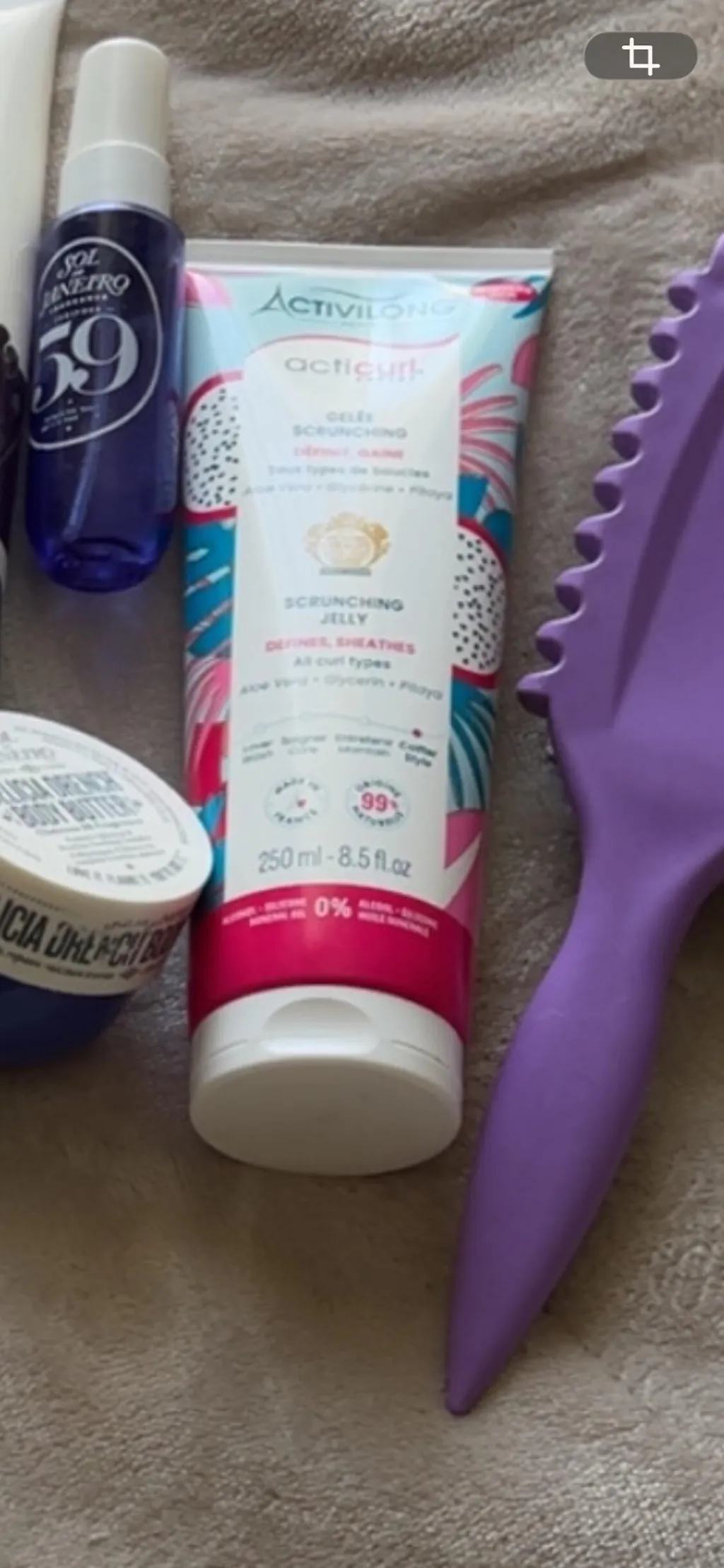 Scrunching Jelly is the perfect ally for curly, wavy or textured hair. Its light texture makes it easy to apply and makes styling easier than ever. Enriched with organic aloe vera juice , it sculpts and defines curls while giving them a natural and light hold . No more cardboard effect: your curls remain soft, defined and full of vitality.