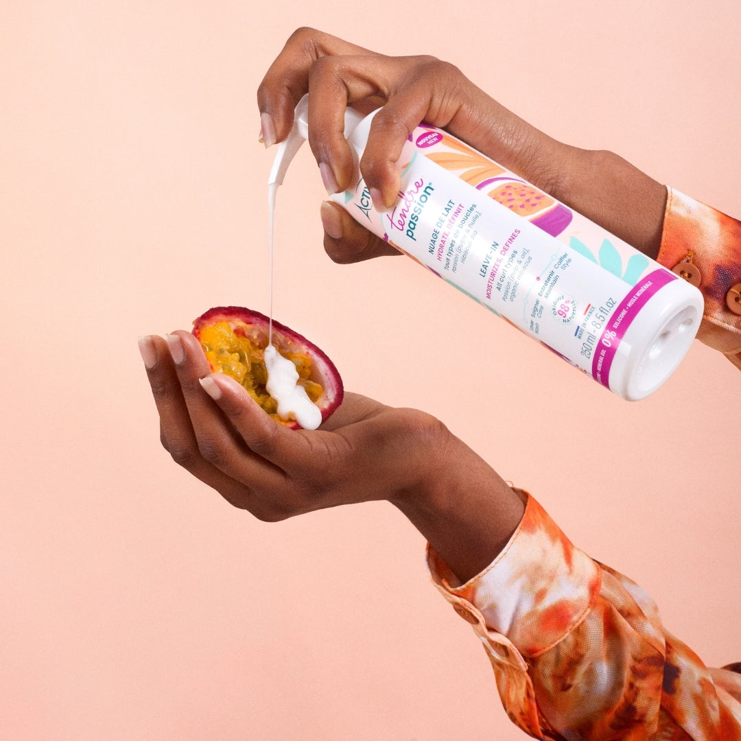 Its vegan formula, without silicone or mineral oil , combines the benefits of organic passion fruit juice, which moisturizes and facilitates detangling , with those of passionflower oil, softening and protective , and organic hibiscus oil, which seals in moisture and helps define curls .