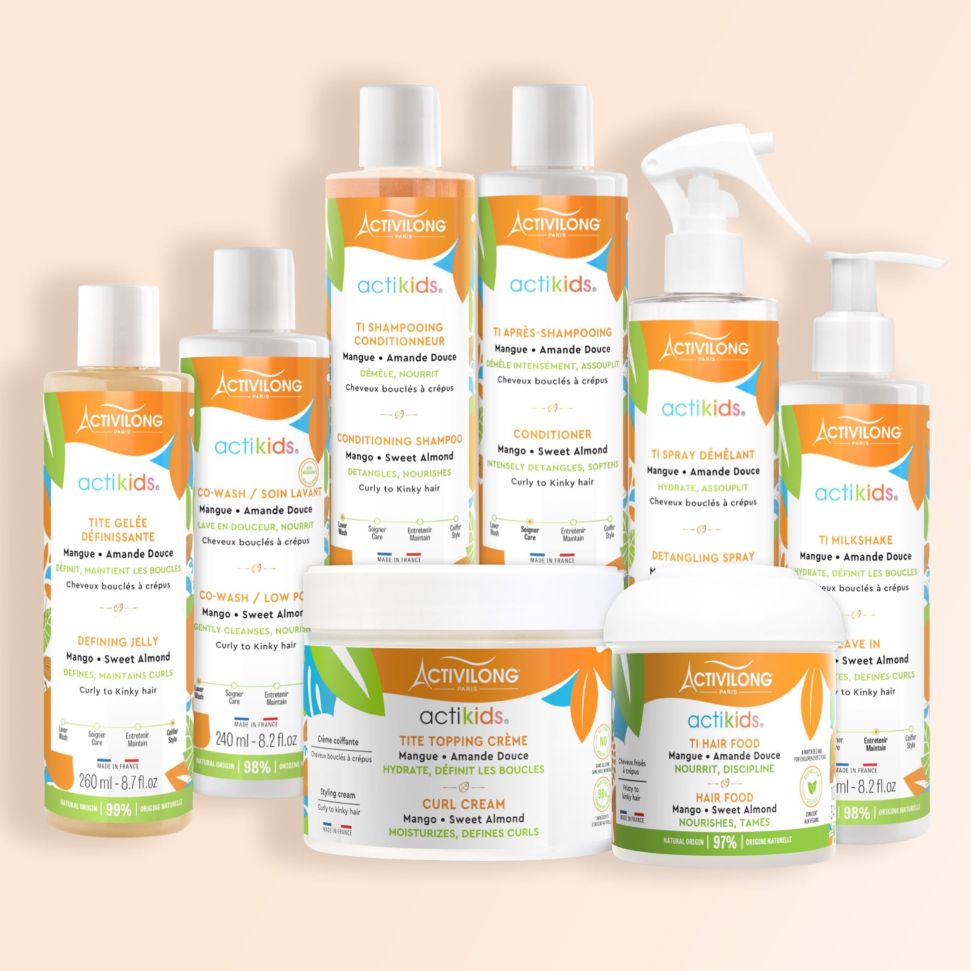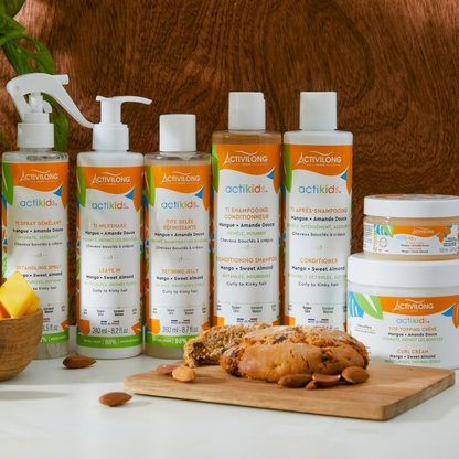 Les actifs choisis pour la gamme Actikids sont la Mangue, qui va nourrir et réparer les cheveux, et l’Amande Douce, qui va adoucir et hydrater.